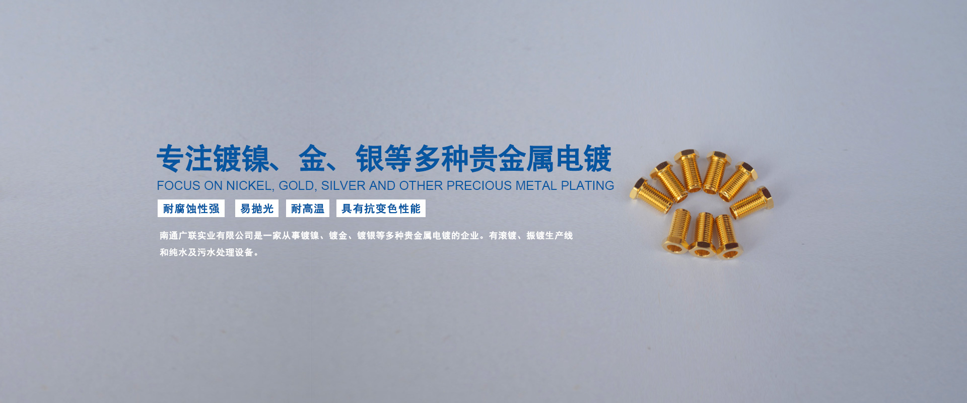 南通廣聯(lián)實(shí)業(yè)有限公司是一家從事鍍鎳、鍍金、鍍銀等多種貴金屬電鍍的企業(yè)。有滾鍍、振鍍生產(chǎn)線和純水及污水處理設(shè)備。